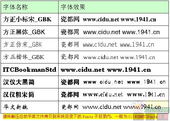 请点击以下字体名称下载相应的字体文件,将解压后的字库文件拷贝到系统目录下的Fonts子目录内,一般为C:\WINNT\Fonts