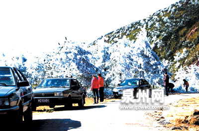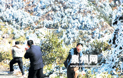 沿着九仙山盘山公路蜿蜒而上,及近峰顶,白茫茫的雾凇漫山遍野。“这太美了,就像仙境一样,真没想到在南方也能看到这种美景。”游人陈小姐兴奋说道,她和朋友一早就开车上山来。得知九仙山有雾凇,山下的许多游人闻讯纷纷驾车而来,嬉戏在这皑皑世界。一群穿着红衣的妙龄少女,格外引人注意。她们手捧雪白的树挂,互相打闹,不亦乐乎。德化旅游局的相关负责人也带着相机赶来,他说:“这个时候出现雾凇是比较少见的,早上特意赶过来拍一些照片,可以成为介绍德化风景的宣传片。”